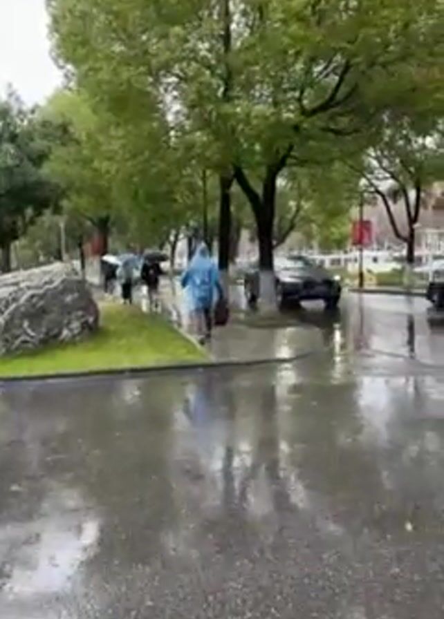 rainy scene with cars driving on a wet road, people walking with umbrellas and wearing raincoats, and green trees lining the street