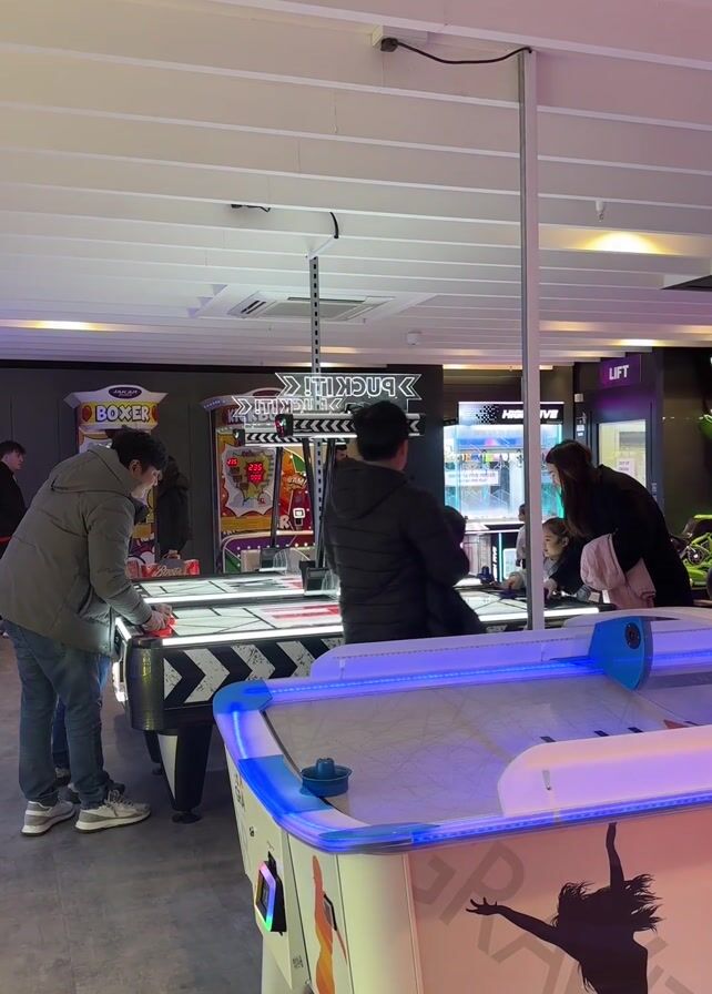 n indoor arcade-like setting with several people playing air hockey. The main focus is on two air hockey tables, both brightly lit with neon accents. One table features a silhouette of a person with arms raised, possibly representing a dance or celebratory gesture. Several people are gathered around the tables, actively engaged in playing the game. Most of them are dressed in casual clothing like jackets and jeans. The lighting is bright, creating a cheerful atmosphere. Other arcade games and signage are visible in the background. The overall environment suggests a leisure space intended for entertainment.