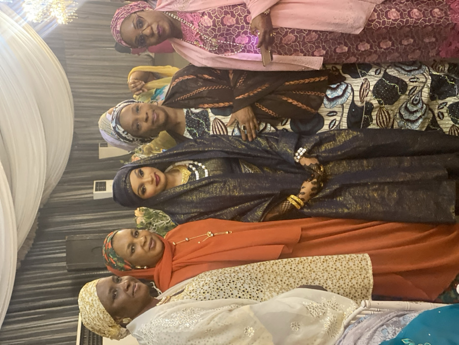 Five women pose, dressed in vibrant, traditional attire. The top woman wears pink with floral accents, followed by a woman in brown and black patterned fabric. The central figure dons a navy blue and gold outfit, complemented by gold bracelets and hennaed hands. Beneath her, a woman is clad in orange with gold jewelry. The bottom woman is in white and gold, with a hint of turquoise at the edge. All have headscarves. The background includes a chandelier and draped white fabric.