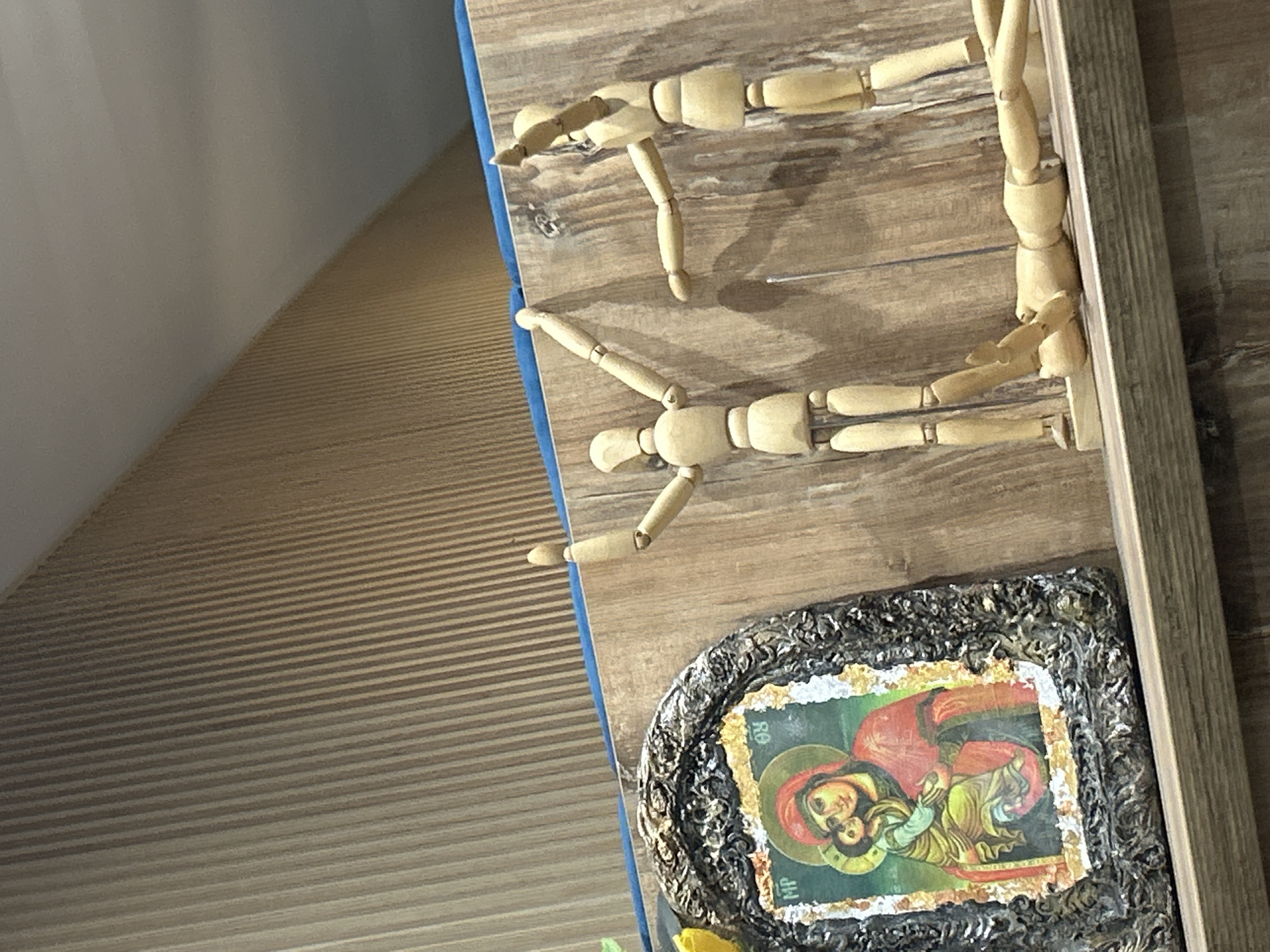 still life on a wooden surface, possibly a shelf or tabletop, set against a background featuring a white wall and a wood-paneled wall. Three wooden mannequins are arranged on the wooden surface. A framed image of an icon, showing the Virgin Mary holding Jesus, is positioned towards the bottom of the composition. A yellow object, possibly a flower, is partially visible in the lower part of the frame. The specific location in Dobrich, Bulgaria, cannot be determined from the image.