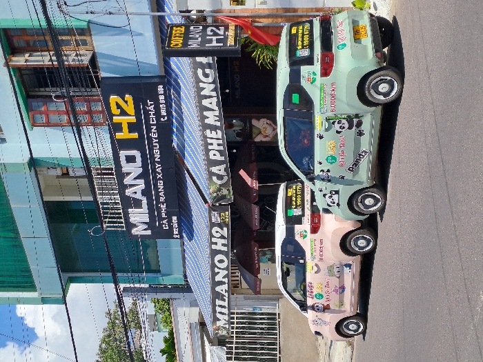 The image captures a daytime urban street scene in Nha Trang, Vietnam. Two compact electric vehicles are parked parallel on the right side of a paved road, facing the viewer's right. The lead vehicle is light green, extensively decorated with black and white panda decals, "Go Lets.vn", "Yêu là Taxi!", "Panda", "5.000đ/km", and a phone number "1900 6779". It has a yellow license plate, partially legible as "79A 203.2X". The second vehicle, parked behind it, is light pink, adorned with various cartoon characters, food items, "Go Lets.vn", "Yêu là Taxi!", and the same phone number. These vehicles are positioned directly in front of a commercial establishment named "MILANO H2", identified by a prominent black sign featuring white and yellow lettering. Below the main "MILANO H2" sign, text in Vietnamese reads "CÀ PHÊ RANG XAY NGUYÊN CHẤT" (Roasted Coffee Beans) and a phone number "0975 898 594". A blue and white striped awning extends from the storefront, beneath which another black sign displays "MILANO H2" and "CÀ PHÊ MANG VỀ" (Coffee To Go). A vertical "COFFEE MILANO H2" sign is attached to the right side of the building facade. The building above the storefront is multi-story, featuring a second-floor balcony with white railings and an open window with dark wooden frames on the third floor. Green construction netting is visible on the upper section of the building. Overhead utility lines crisscross against a partly cloudy blue sky. No individuals are depicted in the scene.