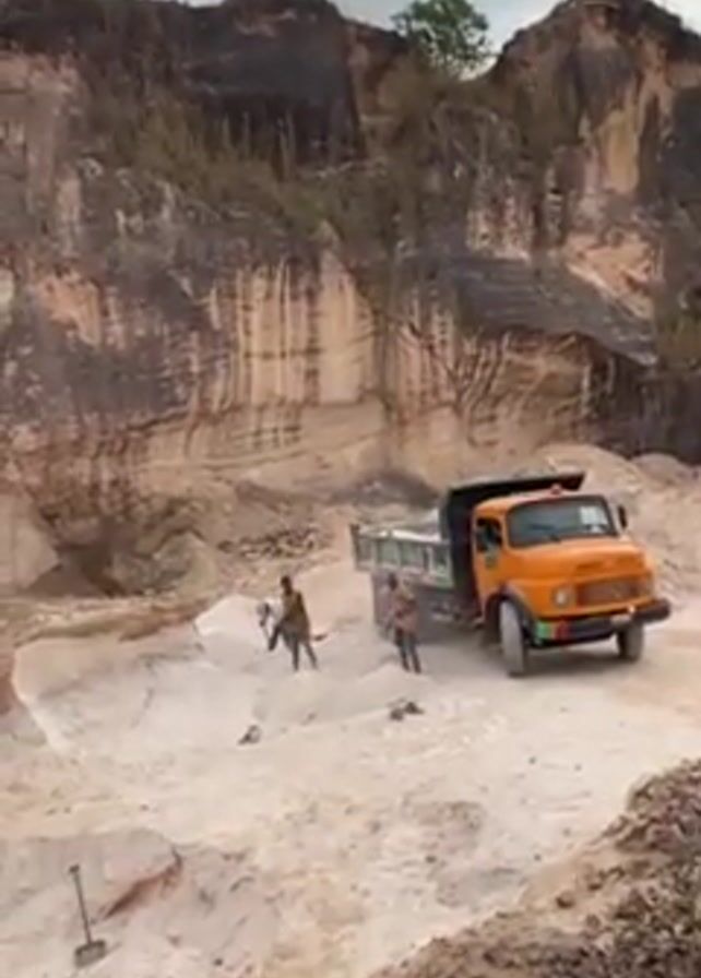 sand quarry on an overcast day. There are three people working in the quarry, using shovels to load sand into an orange and black dump truck. The quarry walls are tall, layered, and light brown, with some trees growing on top. A pile of rocks and sand lines the foreground. The camera zooms out to provide a wider view of the quarry.