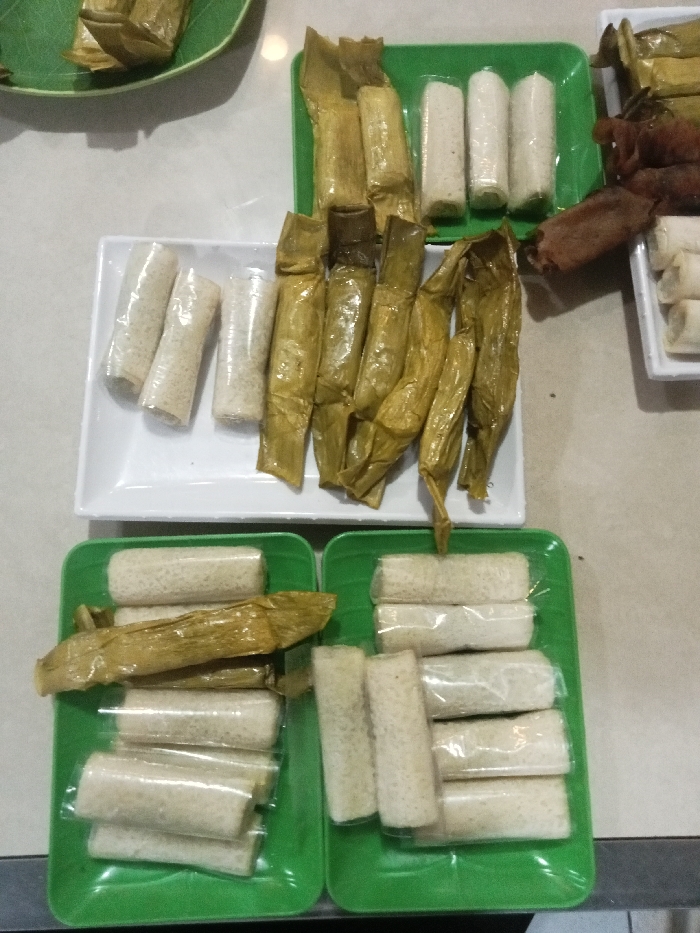 The scene, located in Jurong Binje, Indonesia, depicts an overhead view of various Indonesian food items arranged on a light-colored surface. The items are displayed on a combination of green rectangular plastic trays, white rectangular plates, and a green leaf-shaped plate. In the upper-left, a partially visible green leaf-shaped plate contains several elongated items wrapped in dried, light brown leaves. Adjacent to it, a green rectangular plastic tray holds three cylindrical, off-white items encased in clear plastic, alongside five elongated items wrapped in dull yellowish-brown dried leaves. To the immediate right, a portion of a white rectangular plate is visible, containing a cluster of dark reddish-brown, irregularly shaped objects and several cylindrical items wrapped in clear plastic. Centrally, a white rectangular plate displays four cylindrical, off-white items wrapped in clear plastic on its left side, and approximately nine elongated items wrapped in dull yellowish-brown dried leaves on its right. In the lower section of the image, two green rectangular plastic trays are positioned side-by-side. The left tray contains approximately nine cylindrical, off-white items wrapped in clear plastic, with one additional elongated item wrapped in dull yellowish-brown dried leaves placed horizontally across them. The right tray holds approximately ten similar cylindrical, off-white items, also individually wrapped in clear plastic. All clear-plastic-wrapped items are consistent in their cylindrical shape and off-white, slightly granular texture. The leaf-wrapped items are elongated and exhibit varying lengths and widths, consistent with dried organic wrapping material. The underlying surface is uniformly light in color.