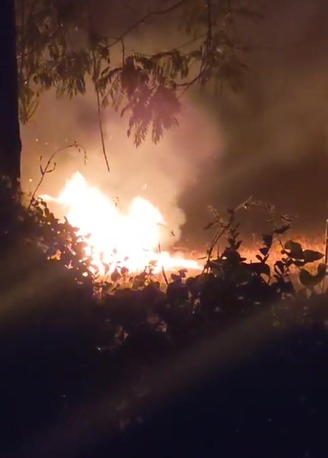 The video depicts a fire burning in a field at night. The flames are bright and there is a lot of smoke. The fire appears to be spreading through the vegetation. There are trees and a utility pole visible in the background, partially obscuring the view. The video is dark and shaky.