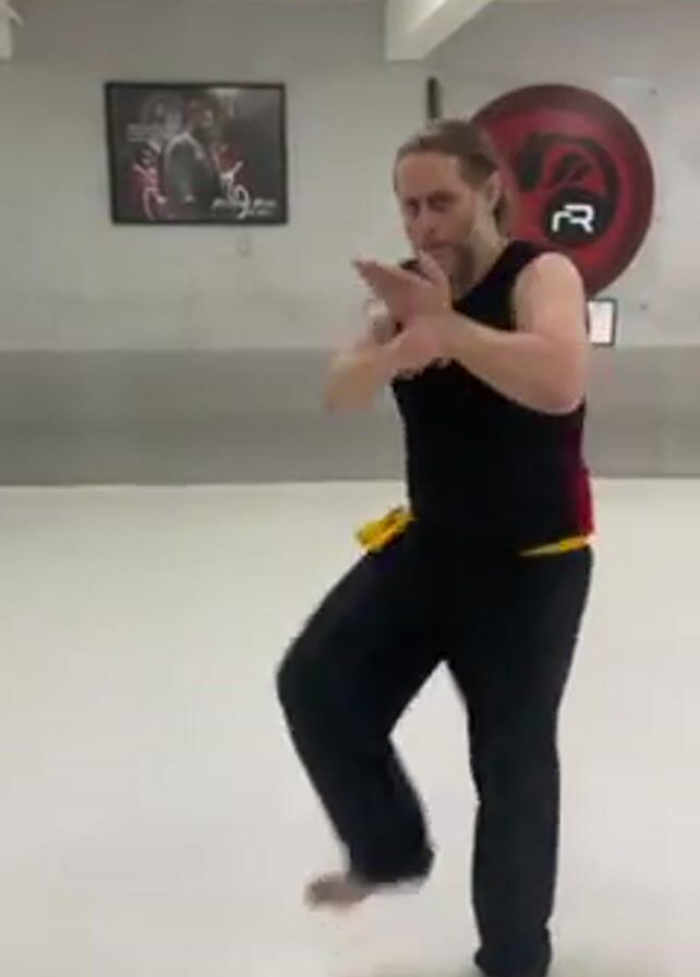 A man in a black tank top and black pants practices martial arts in a studio with white floors