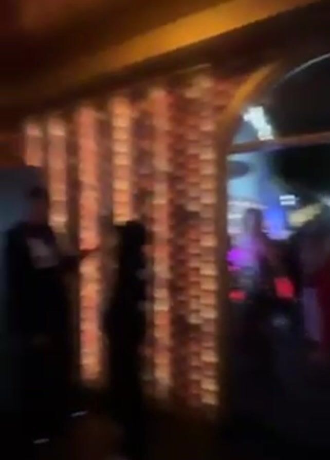A dim, slightly shaky video pans from a close-up view of a decorative archway and corridor, towards a crowded party space