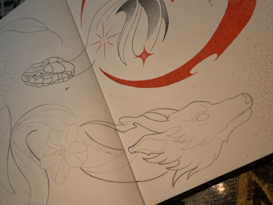 An open sketchpad lies on a dark, patterned surface in Rostov-on-Don, Russia. The left page displays two pencil sketches: an ornate lily-like flower with swirling foliage at the top, and a stylized wolf head with flame-like fur details at the bottom. The right page contains multiple tattoo design elements. At the top right is a pencil outline of a snake's head. Below this, a large, solid red crescent arc is visible, alongside a stippled black and white design resembling an eye with flowing lines. Two outlined stars and one small red stippled star are also present. Red ink or marker specks are scattered across the lower right portion of the page. The artwork combines pencil line drawings with applications of red and black ink/marker. No individuals are present in the image.