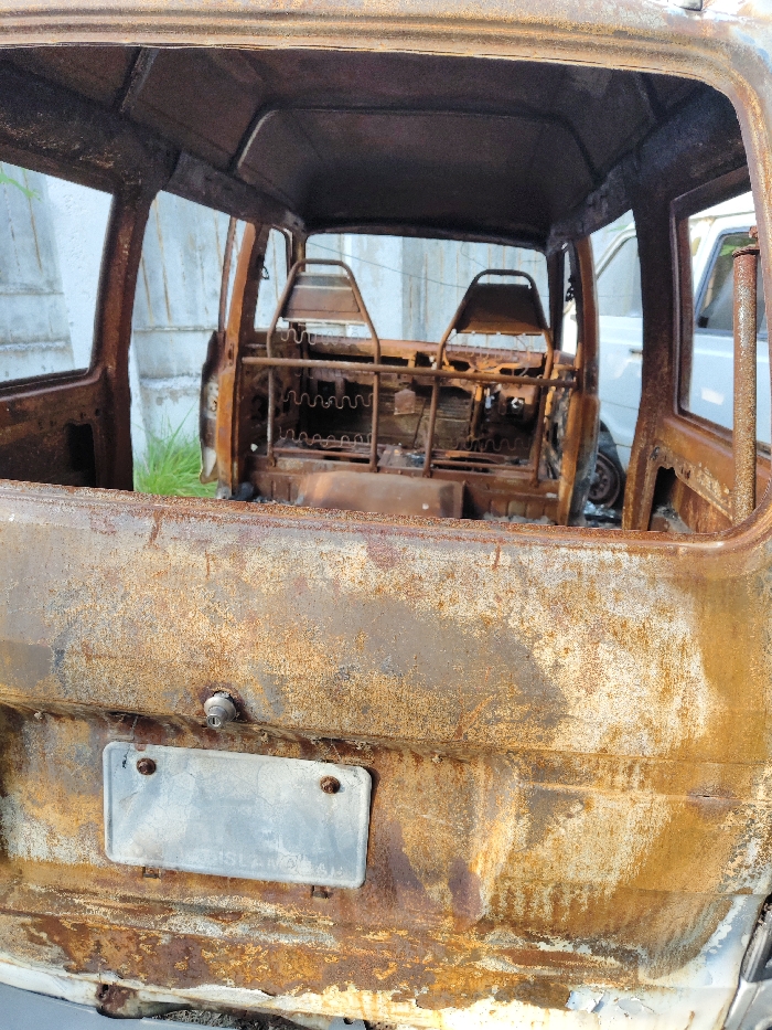 - "The image depicts the severely corroded, stripped chassis of a small van or utility vehicle, observed from the rear exterior looking into the interior, located in Blue Area, Pakistan" by FM-uPtwu2, licensed under CC BY 4.0