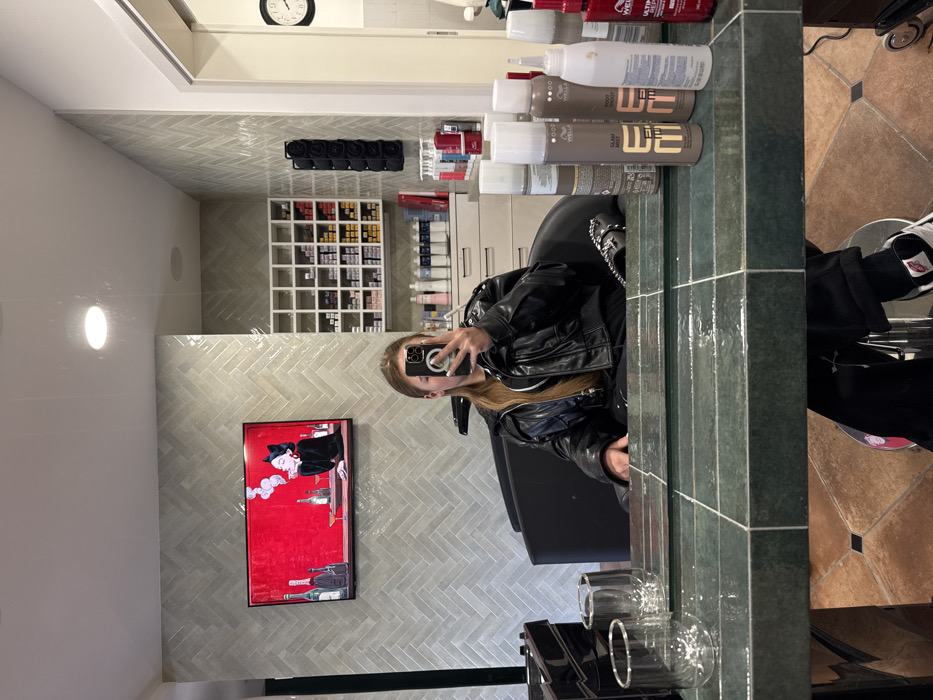 The image displays the interior of a hair salon located in Risan, Montenegro. A single individual, appearing female, is seated in a black salon chair and captured in a mirror selfie. She wears a black jacket, a white inner top, and dark pants. Her face is obscured by the smartphone she holds in her left hand, which has white nail polish. Her long hair is light brown. The mirror, framed by dark green tiled surfacing, reflects the scene. On the mirrored counter surface, two empty clear glass tumblers are positioned to the left of the reflected individual, while several hair product bottles, including products from the Wella brand, are arranged to her right. Behind the individual, a large television screen is mounted on a wall featuring light green, rectangular tiles arranged in a herringbone pattern. The screen displays an illustration of a dark-haired woman with cat ears smoking, surrounded by several wine bottles and a cocktail glass, all set against a red background. To the right of the TV, a white open-cubby shelving unit displays numerous small, rectangular boxes, likely hair color products. Below this shelving, a counter holds various bottles of hair care products. Further right, a black wall-mounted rack with five circular depressions is visible, alongside a white door and a round wall clock indicating a time around 1:00. The floor visible below the mirror is tiled in a light brown pattern with darker square accents. Overhead lighting is visible as reflections on the mirror and ceiling.