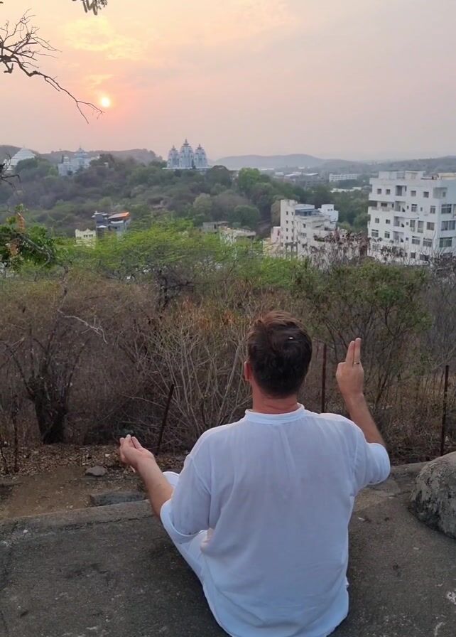 A man in white clothes sits cross-legged on a concrete surface, his back to the camera. He faces a view of a city nestled in a hilly landscape under a hazy, sunset-lit sky. The sun is visible on the horizon, behind a collection of buildings, including a white, dome-topped structure. The man's hands are raised, seemingly in a meditative gesture. The foreground contains sparse, dry vegetation and a few metal fence posts. A portion of a tree branch extends into the upper left corner of the frame.