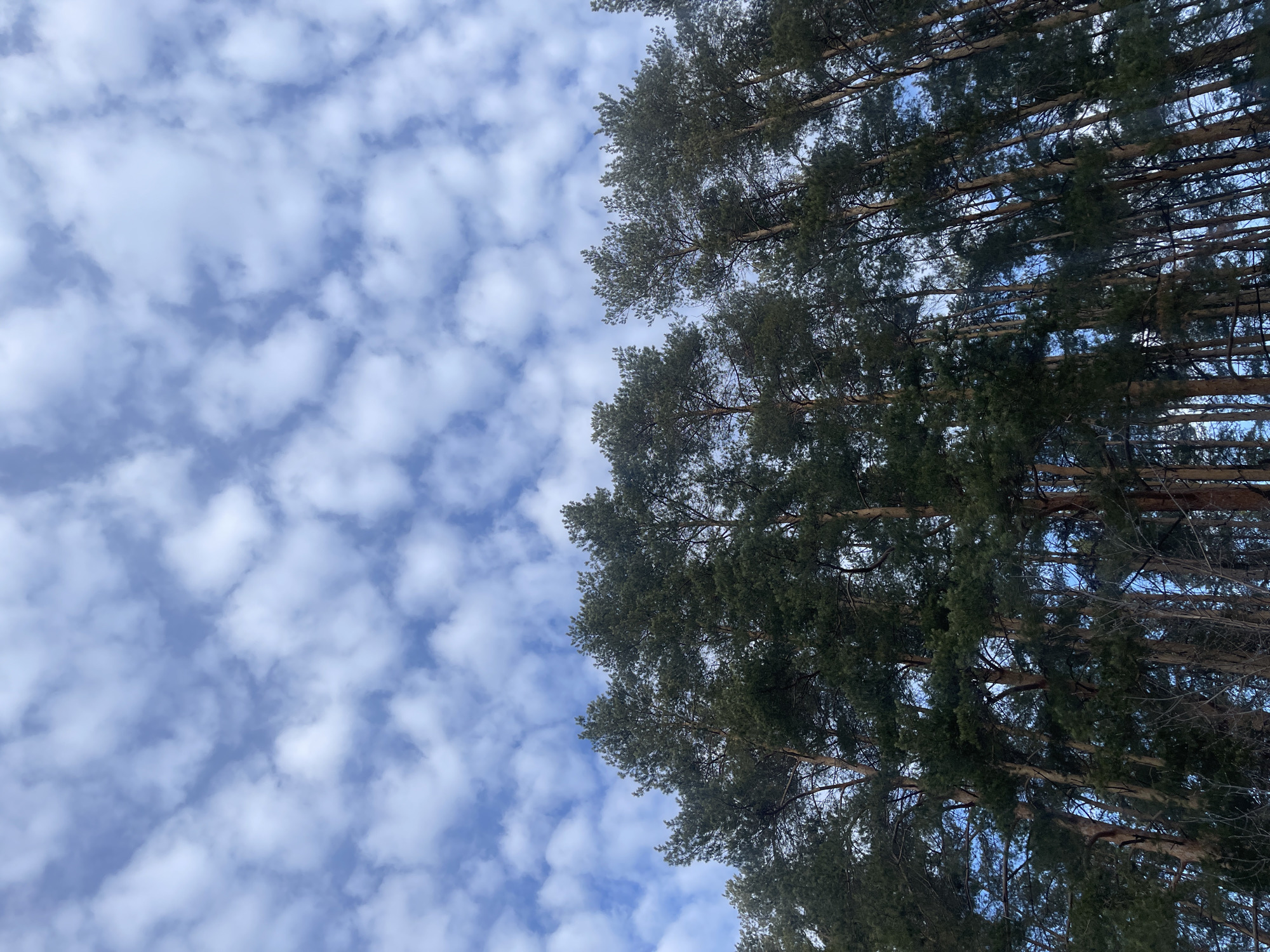 The image displays a low-angle vertical shot of a forest, specifically a stand of tall pine trees, against a sky filled with scattered clouds