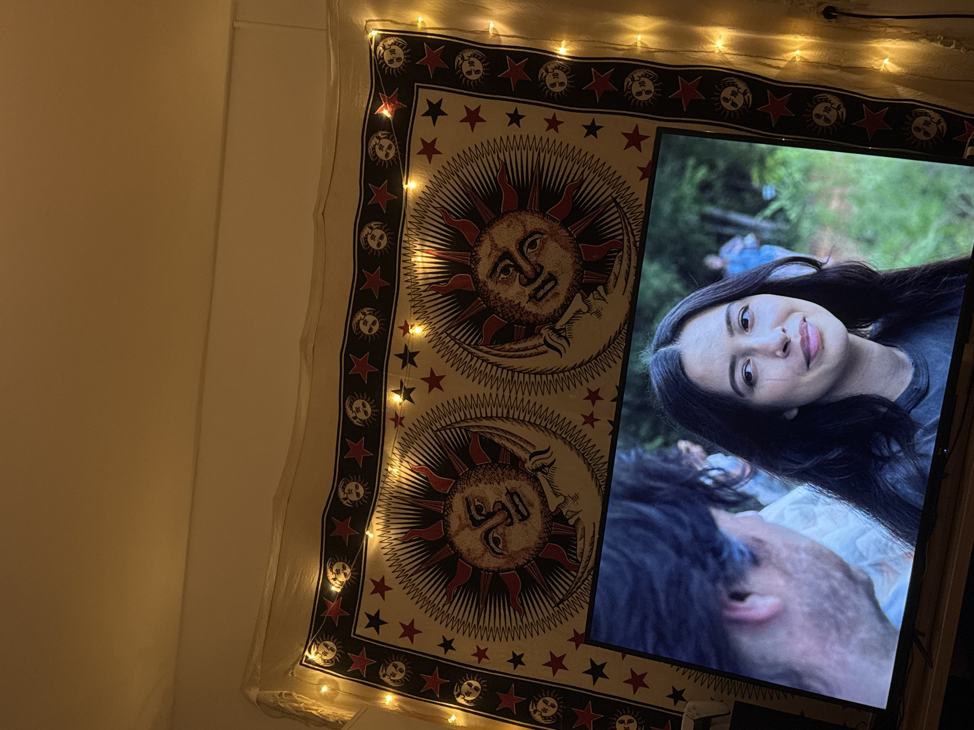 A television screen displays a scene featuring a woman with dark hair, positioned closely to another person's head with dark hair. The background shows blurry green vegetation. The television is framed by a tapestry decorated with sun and moon motifs, red stars, and string lights. The tapestry hangs against a light-colored wall. There is no indication in the image that would suggest the location in the city of Aschbach-Dorf, Austria.