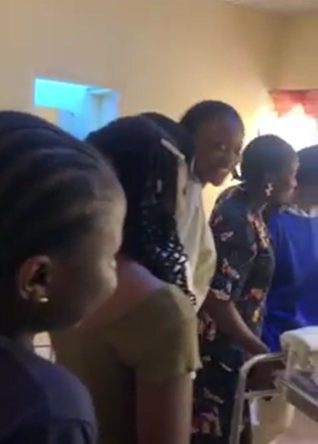 A group of five women are standing in a room in what appears to be a hospital or care facility