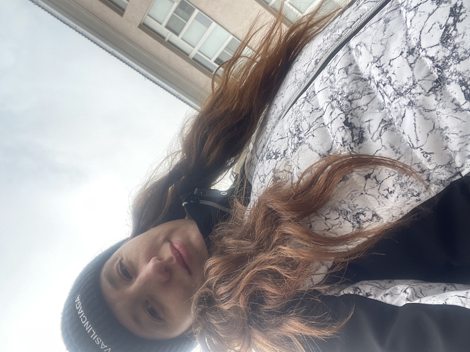 A low-angle outdoor selfie captures an individual, presumed female, with long, wavy reddish-brown hair. The subject wears a black knit beanie featuring white text that reads "VASILINCIAGA," a black high-collared garment, and a white puffer vest with a black and gray marble-like pattern and a visible zipper. Her face is partially visible, looking upwards towards the camera with a neutral expression. The background features an overcast, light gray sky in the upper left and a light-colored multi-story building with a dark sloped roof and several white-framed rectangular windows in the upper right. The scene is situated in Подстёпки, Russia.