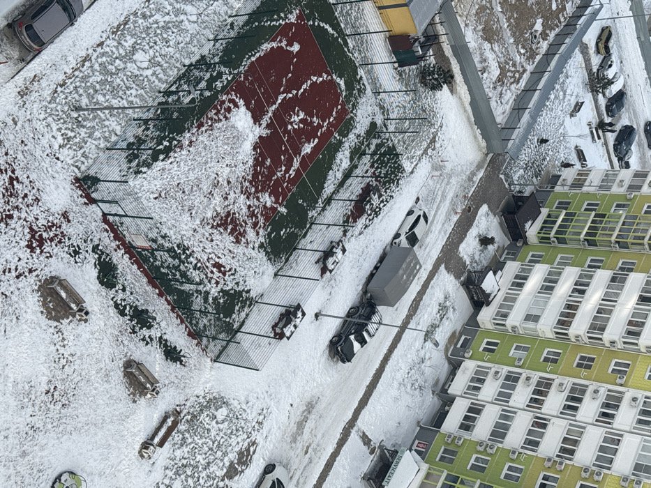 The image displays an aerial view of a snow-covered urban residential environment in Anapa, Russia. The entire visible ground is covered in a layer of white snow. A prominent multi-story residential building with light green and white facades occupies the right side of the frame. This building features multiple windows, some enclosed balconies, and numerous external air conditioning units. At its base, a dark-roofed entrance and a structure with an awning labeled "SERVICE & IT" are visible. In the central area, a rectangular outdoor sports court is enclosed by a dark metal mesh fence. The court surface consists of a dark red central playing area surrounded by a dark green perimeter, both partially covered in snow. Numerous footprints and disturbed snow patterns are evident across the court surface, particularly on the red section. A snow-covered paved area or street runs parallel to the residential building and the sports court. Parked on this surface are a white hatchback vehicle, a grey covered utility trailer, and a dark-colored SUV. Further to the upper left, a snow-covered parking area or street contains multiple other parked vehicles, including a yellow sedan, two white cars, and two dark-colored sedans or SUVs. A silver or light-colored sedan is partially visible in the bottom left corner. Another white car is partially visible on the far right edge. Several snow-covered park benches are situated in the white landscape adjacent to the sports court and near the buildings. Small, bare trees and shrubs are scattered throughout the scene. No individuals are visible in the image.