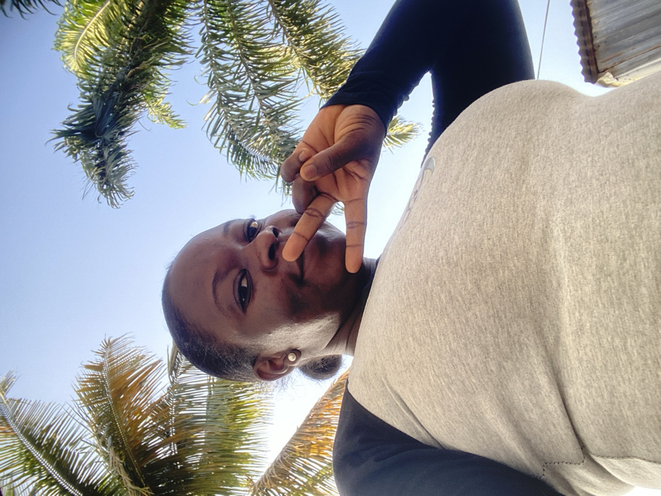 A woman looks upward towards the camera, giving a peace sign. She wears a gray shirt with long black sleeves and a small pearl earring. Palm trees are visible in the background against a bright blue sky. The picture is taken from a low angle, looking up at the woman, and slightly tilted.