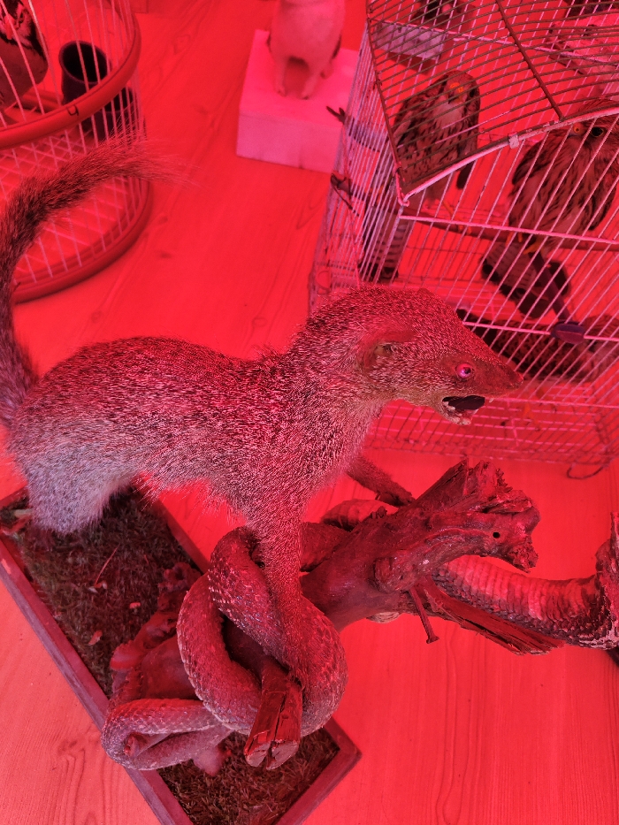 This image depicts an indoor scene under intense red artificial lighting, likely a market stall. The primary subject is a taxidermied Indian grey mongoose positioned aggressively on a dark, gnarled wooden branch, mouth open with bared teeth, and reddish eyes. Its fur is mottled grey-brown. Coiled around the same branch, beneath the mongoose's front paws, is a taxidermied brown snake with visible scales. This taxidermy display rests on a rectangular wooden base filled with artificial green turf. To the right of the central display, a white metal wire cage contains two live birds of prey, likely kestrels, with speckled brown and white plumage. To the left and slightly behind, a partially visible circular metal wire cage is present. In the background, a light-colored taxidermied mammal, possibly a fawn, stands on a white rectangular block. The floor is light-colored, appearing to be wood or laminate. This scene is consistent with a vendor's stall at the Itwar Bazaar (Sunday Market) in Sector H-9, Islamabad, Pakistan.