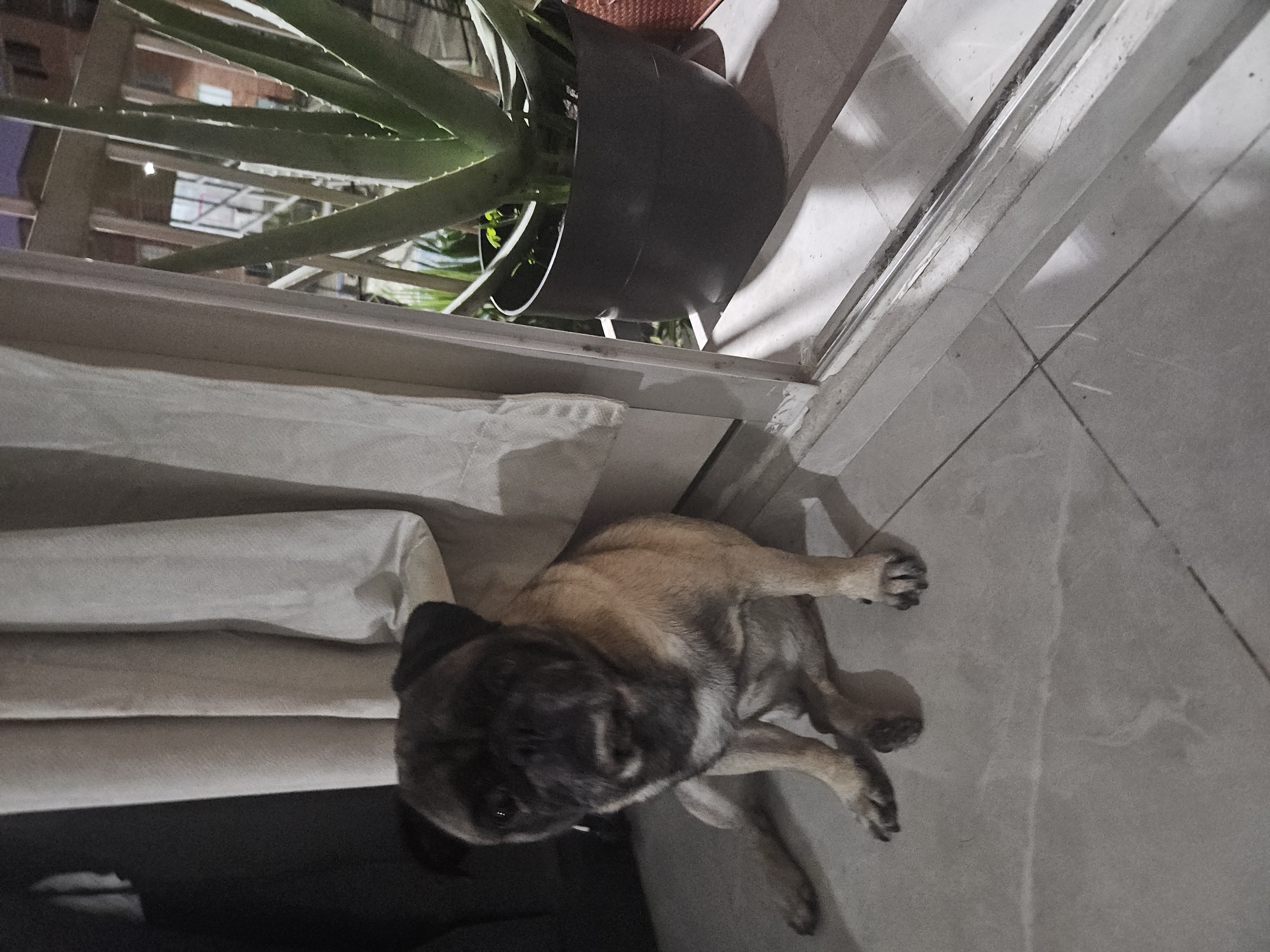 An indoor scene within Perímetro Urbano Cúcuta, Colombia, depicts a pug-type dog positioned on a light gray tiled floor