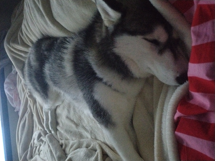 - "A husky dog is sleeping peacefully on a wrinkled beige blanket" by FM-M4lpO2, licensed under CC BY 4.0