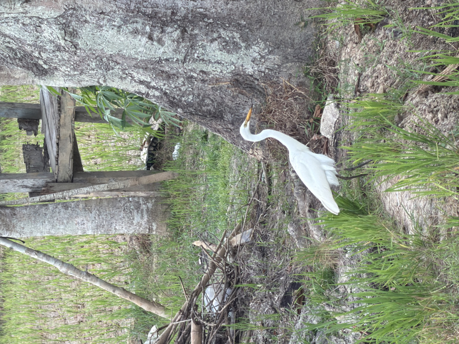 The image depicts an outdoor scene in Blangriek, Indonesia. A single Great Egret (Ardea alba) with white plumage, a yellow bill, and dark legs stands in profile, facing right, on an uneven dirt path in the lower-mid section of the frame. The path is interspersed with patches of green grass or young crops. To the immediate left of the egret, a small mound of dry branches, twigs, and white plastic debris is accumulated. In the mid-ground, a large tree trunk with textured bark is visible on the right, and two thinner tree trunks, one leaning, are present towards the center-left. Behind these central trees, a dilapidated wooden platform or structure, constructed from weathered planks, is situated. The background features an extensive field of uniformly green, juvenile crops, consistent with a rice paddy.