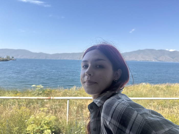 The image depicts an outdoor scene overlooking Lake Sevan in Sevan, Armenia. A young female with shoulder-length dark red hair, wearing a grey and white plaid shirt, occupies the right foreground, angled slightly to her left and looking towards the camera. Her right ear is visible, adorned with a small earring. A light-colored metal railing, exhibiting minor surface rust, extends horizontally across the lower mid-ground. Beyond the railing, the immediate foreground consists of a dense growth of dry, tall grasses and various green plants. The expansive, calm blue water of Lake Sevan fills the mid-ground, receding towards a range of hazy, dark mountains in the distant background that form the horizon. The sky overhead is clear and blue, with a single wispy white cloud visible. No other individuals are present, and no explicit actions beyond posing for the photograph are depicted.