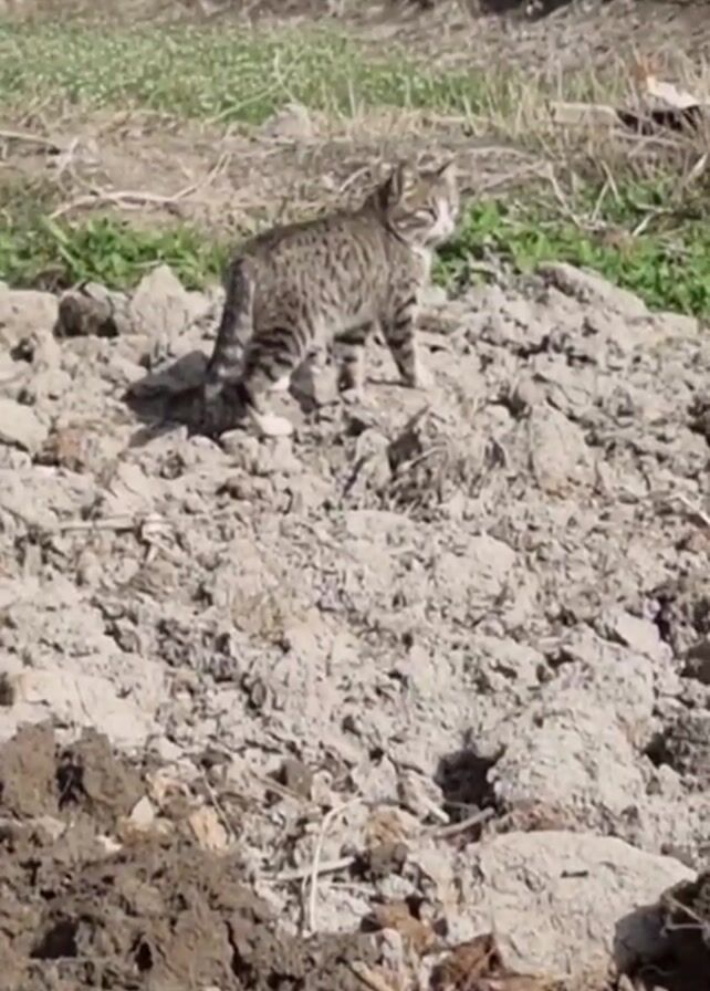 - "tabby cat standing on a pile of dirt" by FM-EU9BD3, licensed under CC BY 4.0