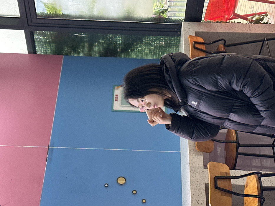 A woman wearing a black puffer jacket and pink-rimmed glasses stands next to a pink and blue ping pong table. She looks at her phone. The ping pong table has a few circular decorations on the blue side. Three wooden chairs with black metal frames are in the background. A window is in the upper left of the image.