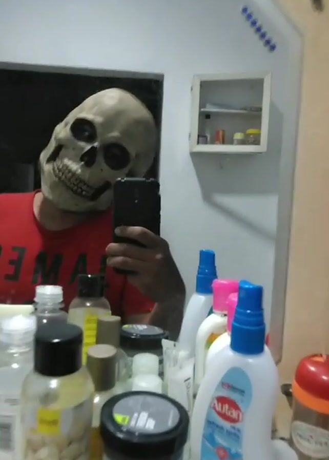 A person wearing a skeleton mask and a red t-shirt with the word "JAMES" visible is taking a selfie in a bathroom mirror. The person is holding a black phone, and their face is obscured by the mask. The bathroom counter is cluttered with various bottles and containers, including Autan lotion and other skincare products. A small, white cabinet with items inside is visible on the wall in the background, as is a mirror with decorative details. The overall lighting is moderate, and the focus is on the masked individual. The camera is handheld and slightly shaky.