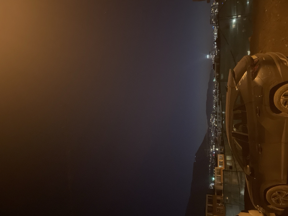The image depicts a nighttime urban landscape in Sofia, Bulgaria, viewed from an elevated vantage point overlooking the city. In the foreground, a dark-colored SUV, identifiable by its taillight design and body contours as a Hyundai Tucson, is parked on an unpaved, reddish-brown dirt or gravel surface. Only the rear passenger side of the vehicle is visible, oriented towards the right. A small portion of a white vehicle is partially visible on the far left edge of the frame. The midground features a panoramic view of the illuminated city, with numerous scattered lights indicating buildings, streets, and residential areas. A prominent tall, brightly lit skyscraper is visible towards the right side of the cityscape. Directly below the city lights, closer to the foreground, are outlines of structures, some appearing to be partially constructed or undeveloped plots. In the background, the dark silhouette of Vitosha Mountain is visible on the left, with sparse lights indicating activity or structures on its lower slopes. The night sky transitions from a deep indigo near the horizon, affected by city glow, to a warmer, diffuse orange-brown hue in the upper portion of the frame, suggesting atmospheric light pollution. No individuals or direct interactions are visible.