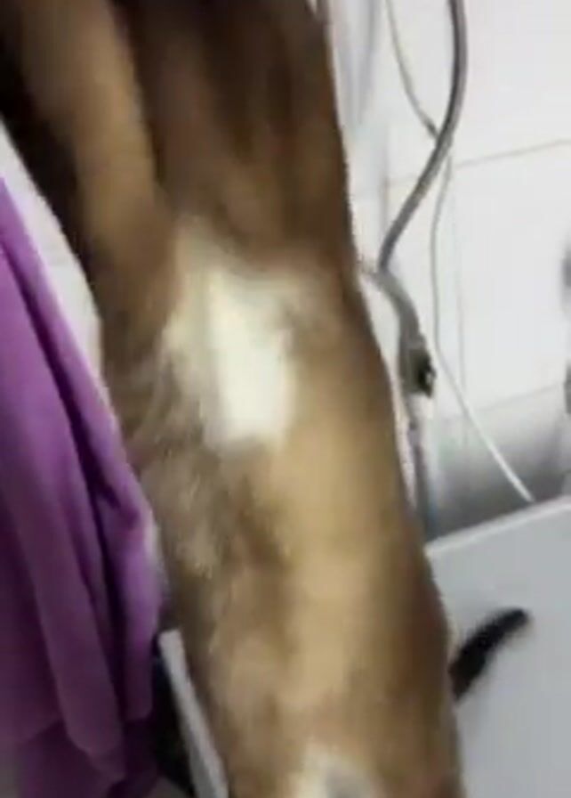 cat in a bathroom jumping for something out of view. The cat is a brown, white, and black tuxedo cat with white paws. The cat stands on its hind legs, extending its front paws upwards with its claws extended. Behind the cat are white tiled walls, a purple towel, and some plumbing fixtures. The cat is the primary subject of the video and the camera focuses on it throughout the short clip.