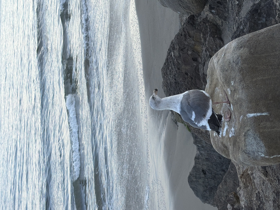 - "A gray and white seagull perches on a large rock at the edge of a beach" by FM-xILGl2, licensed under CC BY 4.0