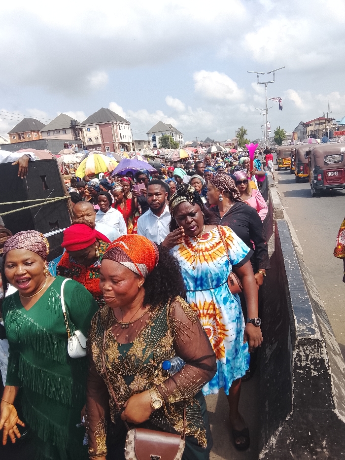 A wide-angle, slightly elevated outdoor shot captures a dense crowd of individuals moving along a thoroughfare, consistent with a bustling market street in Umuahia, Nigeria