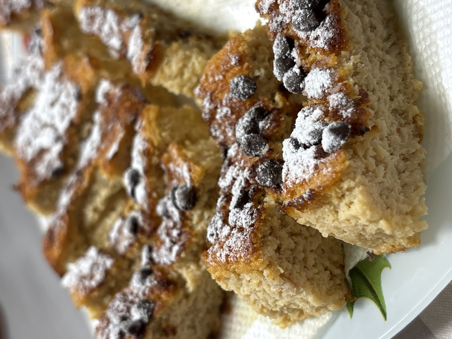 - "A close-up, elevated perspective photograph displays multiple irregularly cut rectangular pieces of a light-colored baked good, consistent with a cake or sweet bread, arranged on a white serving platter" by FM-vNO8t2, licensed under CC BY 4.0