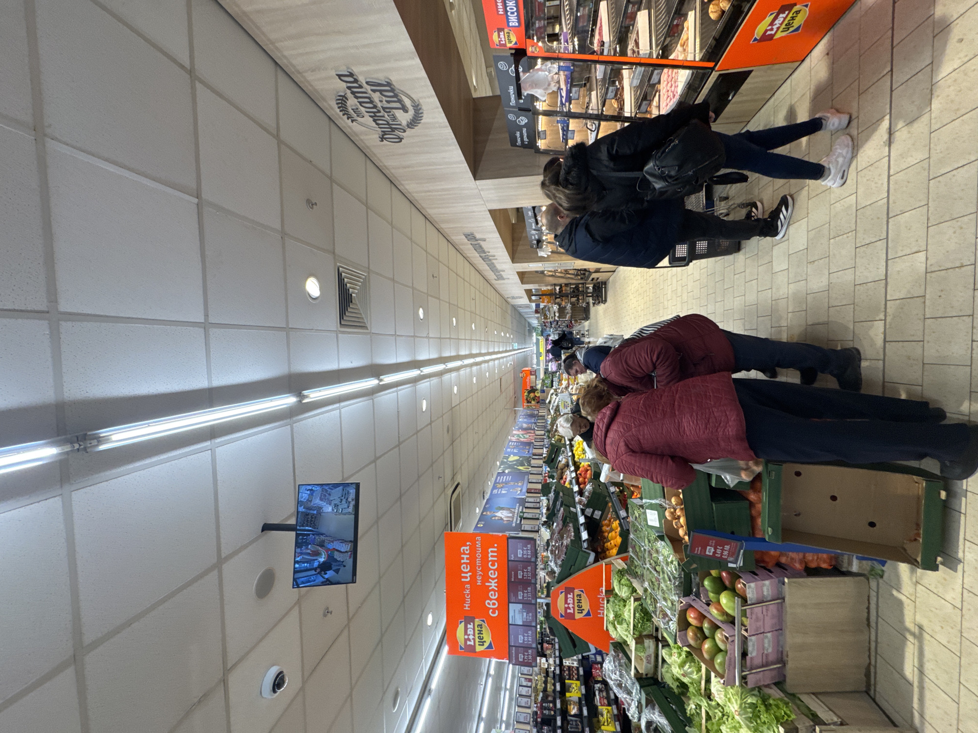 The image depicts the interior of a Lidl supermarket in Sofia, Bulgaria, characterized by prominent "Lidl" branding and Bulgarian text on various signs. The scene shows a busy retail environment with multiple customers shopping. In the foreground, two individuals are examining produce. One person, seen from the back, wears a dark red quilted jacket and dark trousers, and is placing items into a clear plastic bag from a display of green plastic crates containing lettuce and mangoes. Another person, partially visible to their right, also wears a similar dark red jacket. Produce sections featuring various fruits and vegetables are arranged in crates and cardboard displays, marked with orange "Lidl цена" (Lidl price) signs displaying prices in Bulgarian Lev and Euros. In the mid-ground, a male in a dark blue jacket pushes a black shopping basket on wheels, standing alongside a female in a dark winter coat with a fur-lined hood and dark blue jeans, carrying a black backpack. They are positioned near a bakery section with glass display cases containing baked goods. A large sign above this section reads "От фурната на Lidl" (From Lidl's bakery) on a wooden-paneled wall. Further into the store, more customers are visible along the aisles, which are stocked with various products. The store features a light-colored tiled floor and a white suspended acoustic tile ceiling. Numerous long fluorescent light fixtures illuminate the space. A dome-shaped security camera is visible in the upper left, and a flat-screen monitor suspended from the ceiling in the upper center displays multiple security camera feeds of the store's interior. Air conditioning vents and smoke detectors are also present on the ceiling.