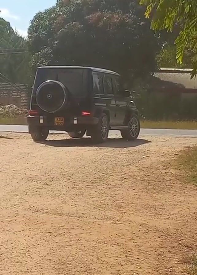 black Mercedes-Benz G-Class SUV parked on a dirt road next to a paved road. The SUV has a spare tire mounted on the rear door. The SUV appears to be idling. A white and yellow vehicle drives past the SUV on the paved road. There are trees and buildings visible in the background. The weather appears to be sunny.