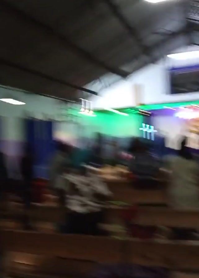 group of people in what appears to be a church or a large meeting hall. The people are standing and moving around, some are clapping or raising their hands in the air. There is a stage with a screen and lights at the front of the room. The seating consists of wooden benches. The walls are painted white and purple, and there are blue curtains in the background. The ceiling is corrugated metal with exposed beams. The lighting is provided by overhead fluorescent lights.