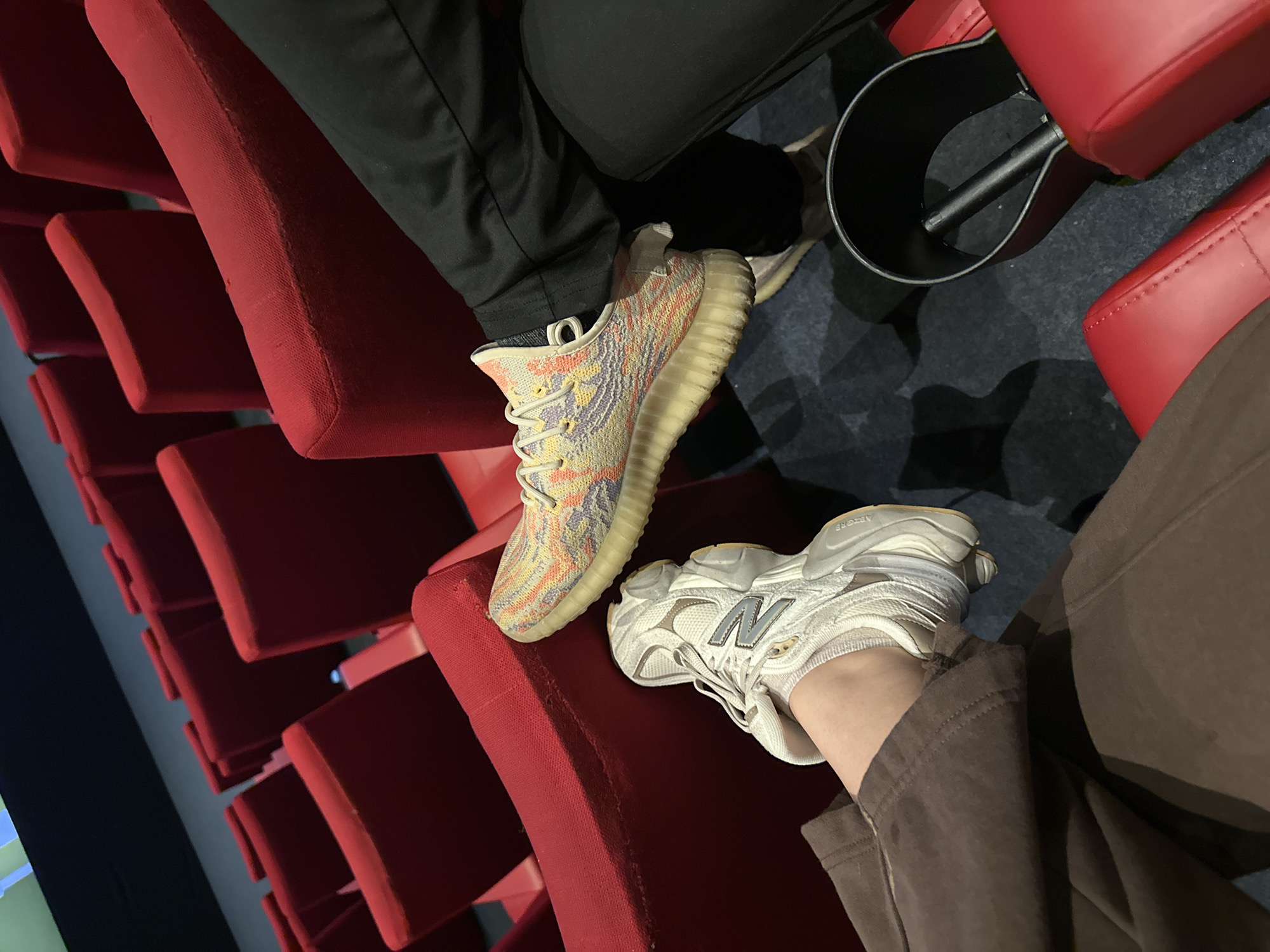 view from above, likely taken inside a movie theater. Two people are seated in red theater chairs, one wearing black pants and multi-colored Yeezy sneakers, the other wearing brown pants and white New Balance sneakers. A black cupholder is visible between the seats. The background shows rows of empty red theater chairs. The image was not necessarily taken in the city of Esenyurt, Turkey.