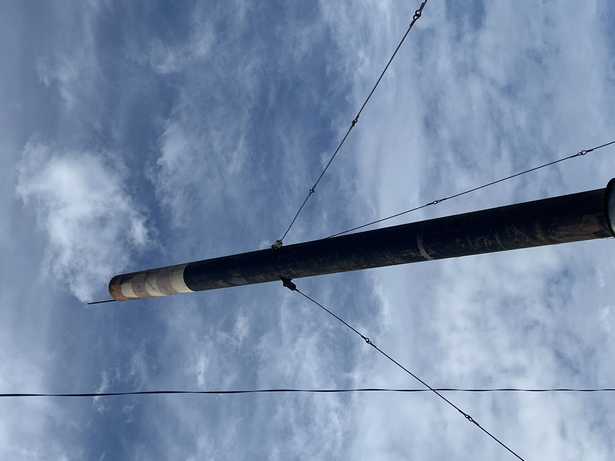 cylindrical, possibly metal, pole extending diagonally across a cloudy sky