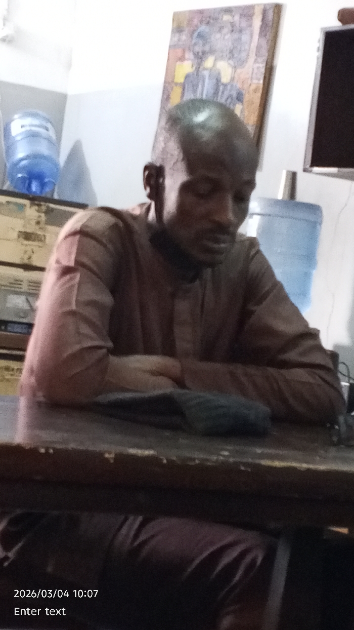 An indoor scene in the city of Dakata, Nigeria, depicts an adult male seated at a dark, worn wooden table