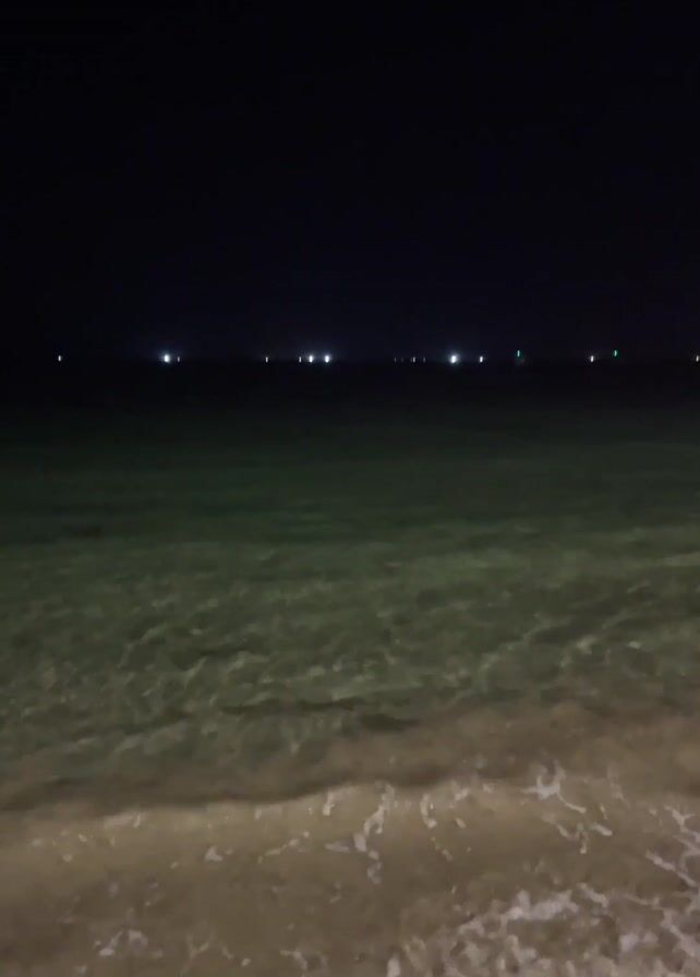 beach at night. The waves are gently washing onto the shore. In the distance, there are lights from buildings along the coastline. People are walking and standing on the beach, some are in the water. There is a plastic cup on the sand.