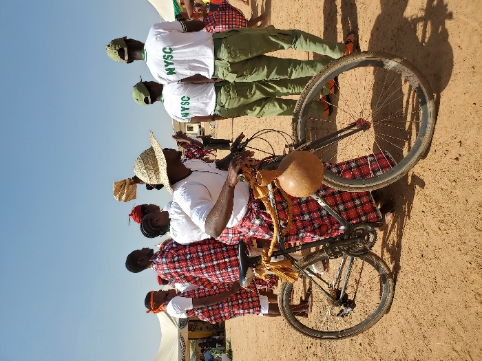 An outdoor scene in Bar Gada, Nigeria, depicts a gathering on a dusty, unpaved ground under a clear blue sky. In the foreground, an adult male, wearing a white short-sleeved top, a red and white plaid wrapper, and a straw hat, stands partially turned to the right, holding a dark-colored bicycle. The bicycle is adorned with a large brown gourd tied to the front frame and additional tan fabric strips wrapped around the handlebars and frame. To the left of the central figure, several individuals, likely younger adults, are visible from behind, similarly dressed in white tops and red and white plaid wrappers. Some wear red head coverings. They face generally towards the right. To the right of the central figure, three individuals, also seen from behind, wear white t-shirts with "NYSC" printed in green, green fatigue-style trousers, and green caps. One wears orange sandals. All individuals appear to be observing something to the right, outside the frame. In the mid-ground and background, multiple white and cream-colored canvas tents are erected. Distant figures are visible near the tents. The environment suggests an open-air event or cultural celebration, characterized by consistent attire among groups of participants. Shadows indicate strong overhead sunlight.