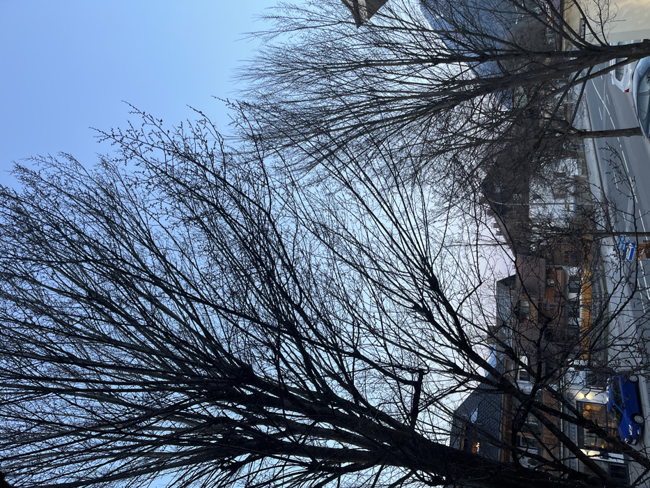 The image depicts a street scene in Garmisch-Partenkirchen, Germany, viewed from a slightly elevated position, likely a window or balcony. The sky is clear, transitioning from a pale blue overhead to a lighter, almost white hue near the horizon, indicative of late afternoon or early evening. The foreground is dominated by the dark, bare branches of several deciduous trees, silhouetted against the sky. The tree on the far left has a dense network of finer branches, with small buds visible on some tips. Below and beyond the trees, a two-lane asphalt road runs horizontally across the midground. Several vehicles are parked along the street: a blue sedan or station wagon on the left, and a silver SUV and a dark sedan further down the street on the right. A blue street sign is partially visible on the left side of the road. Along both sides of the street are multi-story buildings, characteristic of traditional European or Alpine architecture, featuring sloped roofs, visible windows, and balconies. Some windows show interior illumination, suggesting evening. Mountains are visible in the background, particularly towards the right side of the frame, rising behind the buildings. No individuals or active interactions are visible within the scene.