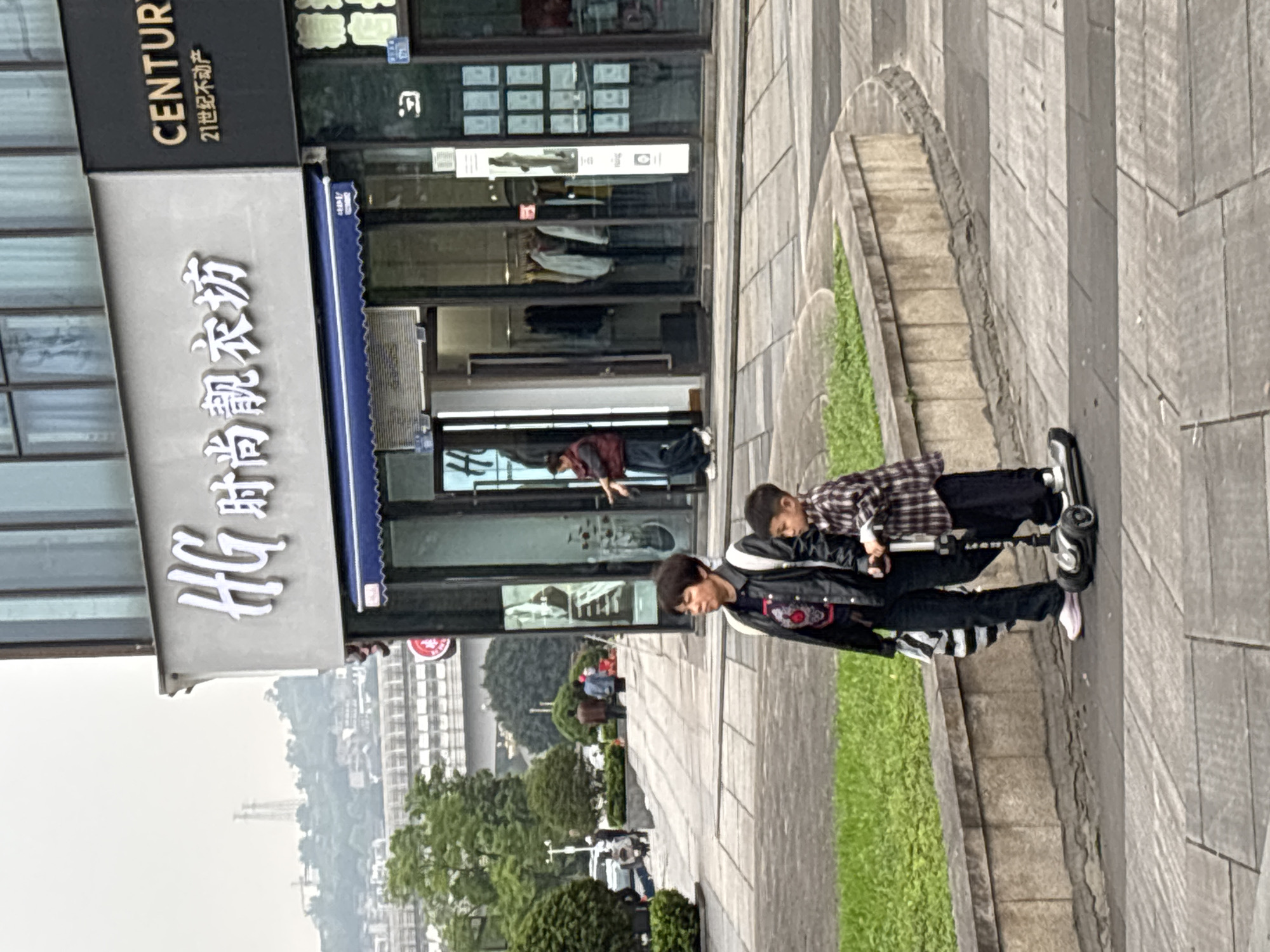 This image captures an outdoor urban scene in Jiangjin, China, under an overcast sky. In the foreground, an adult female and a young boy walk on a grey tiled sidewalk. The female, wearing a black leather-look jacket over a dark graphic t-shirt, dark pants, and light pink shoes, holds the boy's right hand with her left. A black and white striped bag hangs from her left shoulder. The boy, wearing a dark plaid long-sleeved shirt and dark pants, stands on a black three-wheeled scooter with chrome accents, holding its handle. Behind them to the right are two commercial storefronts. The primary establishment features a grey facade with "HG 时尚衣坊" (HG Fashion Boutique) in white raised characters and a blue awning above the entrance. Adjacent to it is a storefront with a black facade displaying "CENTURY 21 世纪不动产" (CENTURY 21 Real Estate) in white text. Both shops have glass doors and windows. In the mid-ground, a raised concrete planter box with green grass separates the immediate sidewalk from a wider paved area where several indistinct individuals are present, walking. The background features an elevated multi-lane roadway or bridge. Beyond this, hills covered with trees and buildings are visible, topped by a tall industrial tower or chimney, all partially obscured by atmospheric haze.