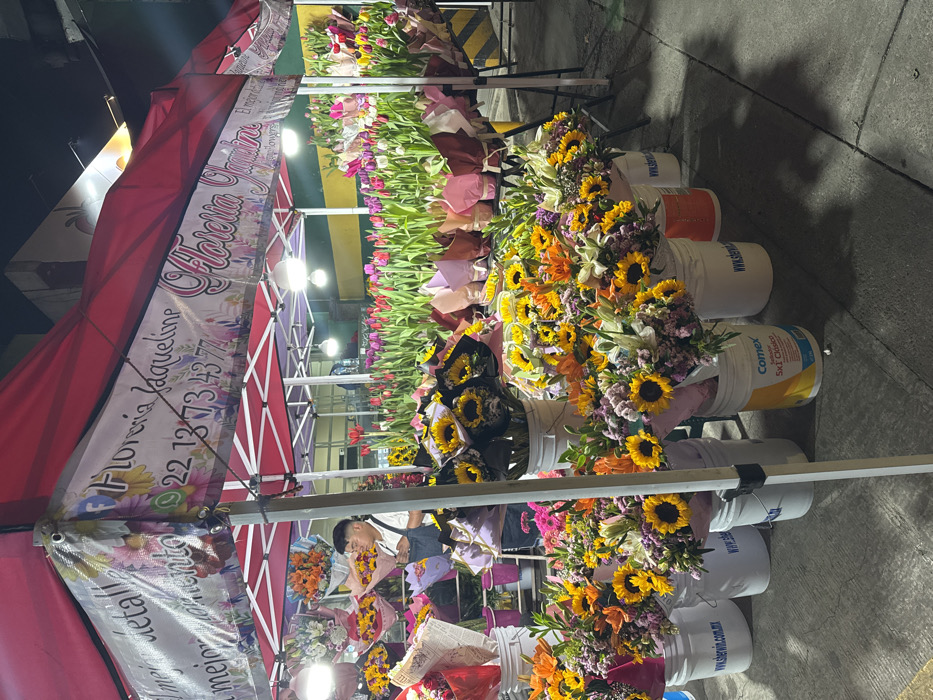 A vibrant flower stand showcases a variety of blooms. Bunches of colorful tulips and mixed flower arrangements featuring sunflowers and lilies are displayed in buckets. The stand, named "Floreria Jaqueline," has a red and white awning. A person stands behind the display, surrounded by the flowers. The scene is likely at night, illuminated by artificial lights.