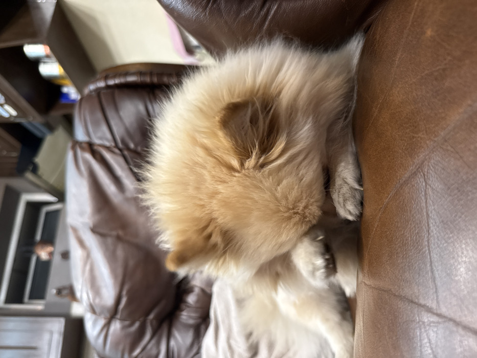 - "A light-colored, fluffy Pomeranian-type canine is observed resting on a brown leather sofa in an indoor setting within Razlog, Bulgaria" by FM-CCOQt1, licensed under CC BY 4.0