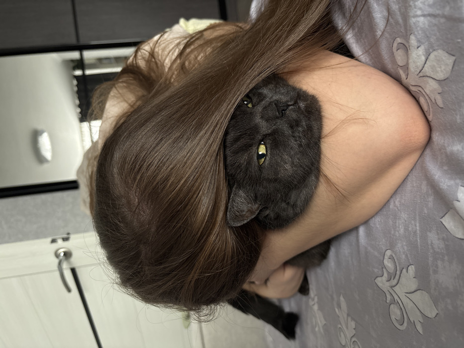 - "A gray cat with striking yellow eyes is nestled into the arm and hair of a person" by FM-FRFuw2, licensed under CC BY 4.0
