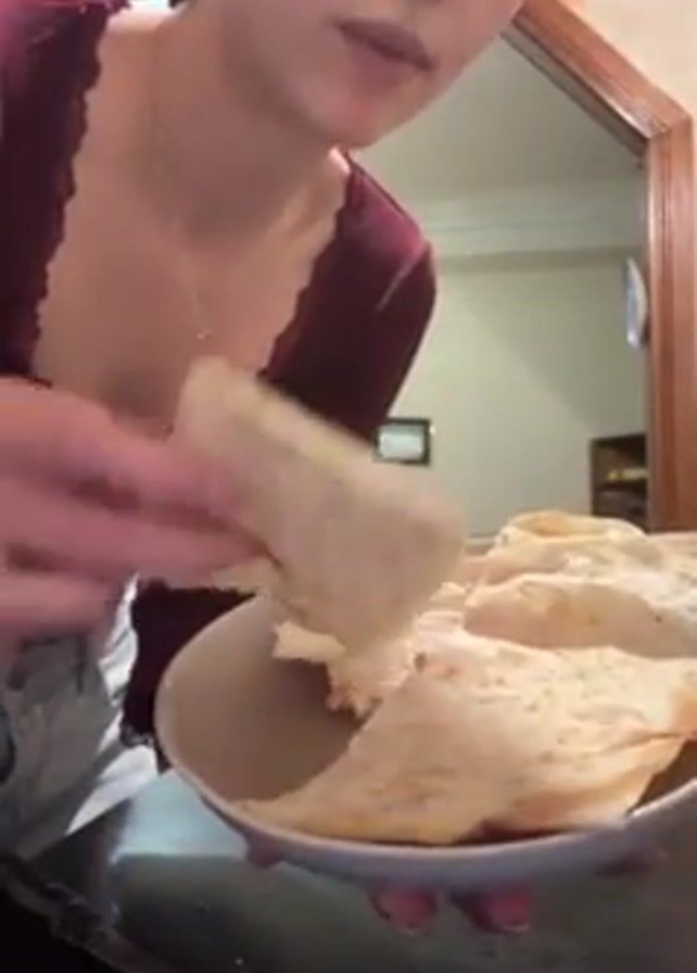 A fair-skinned woman with light brown hair and wearing a maroon lace-trimmed top and light-colored jeans stands in a kitchen and holds up a white bowl containing flatbread. She pulls off a piece, takes a bite, and chews. The kitchen is furnished with dark countertops and a wooden doorframe is visible in the background.