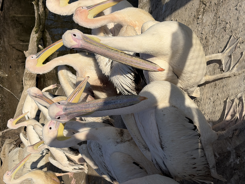 - "A group of approximately 10-15 pelicans, likely Great White Pelicans, are congregated on a dry, earthen bank beside a body of water" by FM-fHMy02, licensed under CC BY 4.0