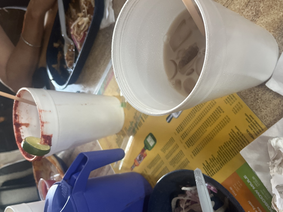 A cluttered table presents a casual dining scene. Styrofoam cups hold beverages; one, a brown liquid with ice, the other rimmed with red and garnished with lime. A blue water dispenser sits nearby. A dark dish filled with shredded food rests close to a menu card with densely printed text. Another dark dish contains what appears to be a salad of shredded cabbage and onion. A person's arm is visible in the upper left corner, and crumpled napkins complete the scene.