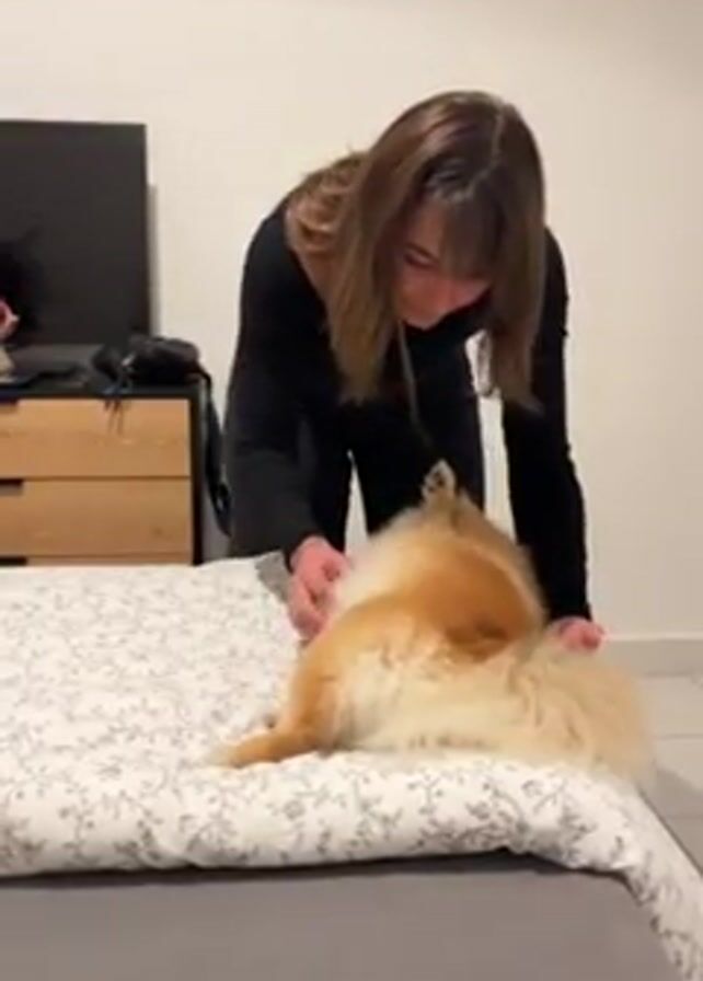 A fair-skinned woman with shoulder-length brown hair and bangs is standing next to a bed and petting a Pomeranian dog lying on its back. The woman is smiling and wearing a long-sleeved black top and black jeans. The dog is light brown and white with a fluffy tail. The bed has a grey frame and is covered in a white patterned bedspread. Behind the bed is a nightstand with a dark TV on top and a black bag on the shelf. The room has white walls and a tile floor. The video is brightly lit.